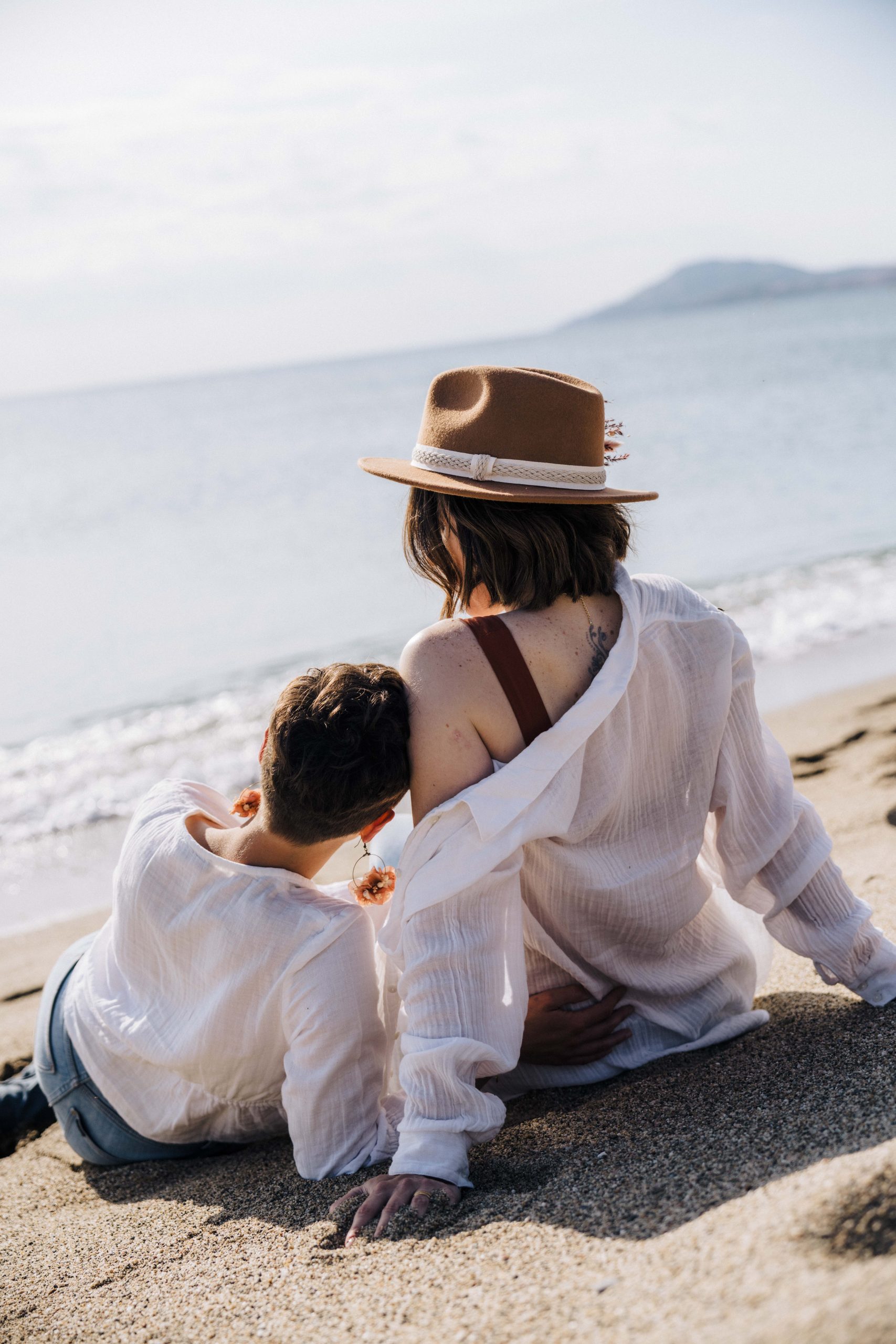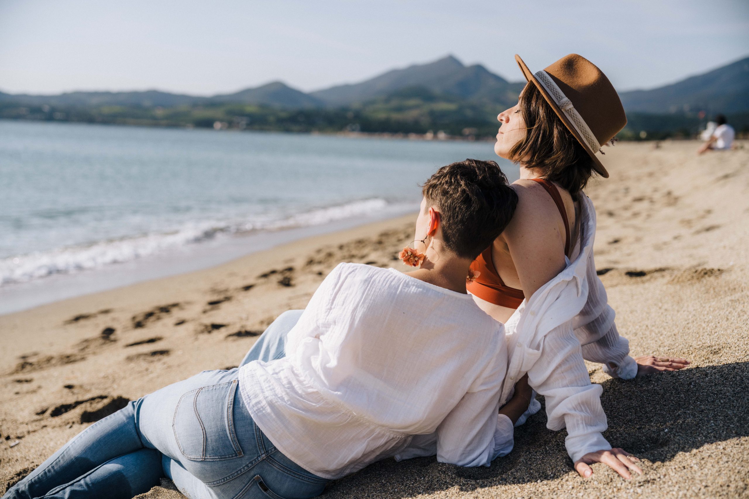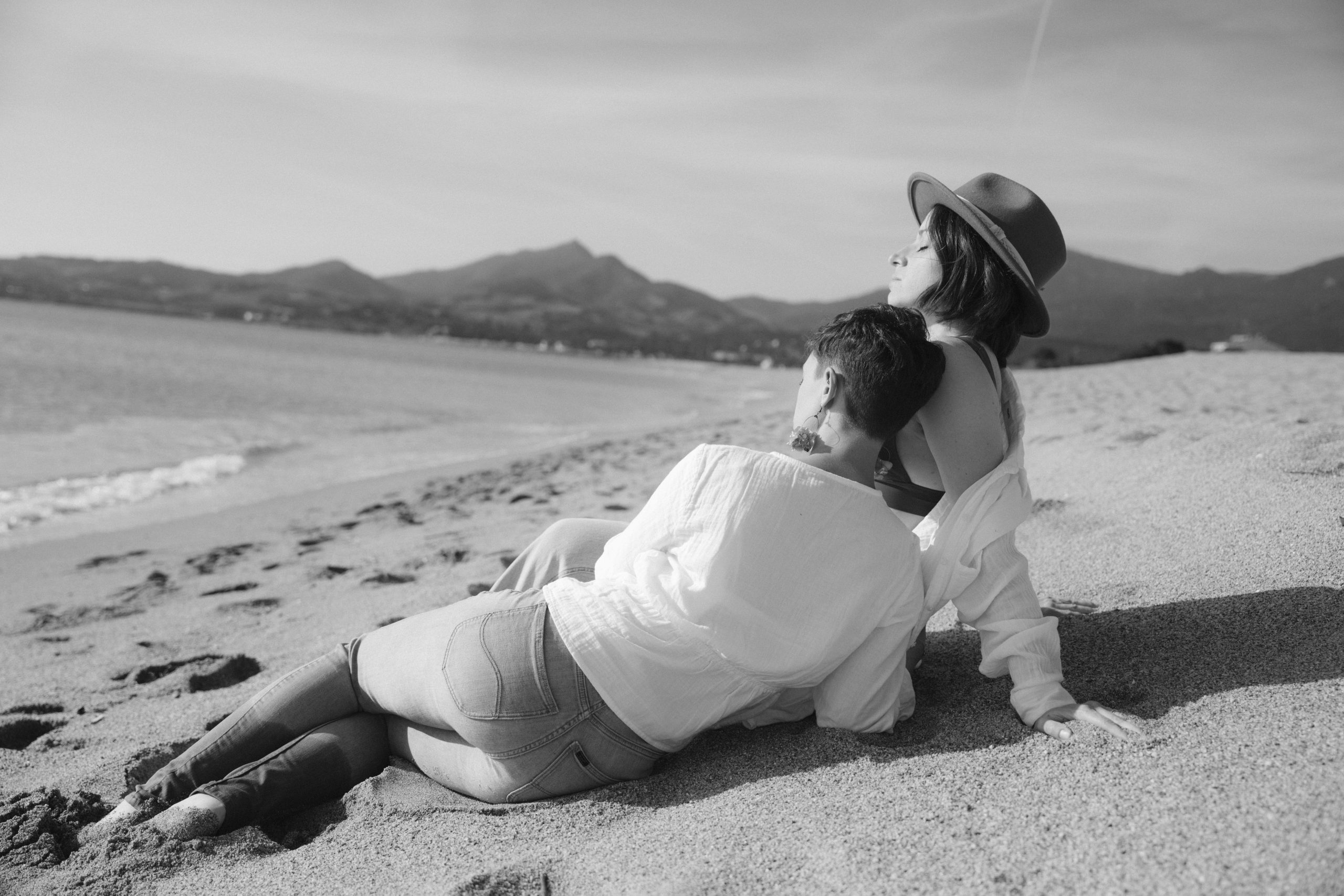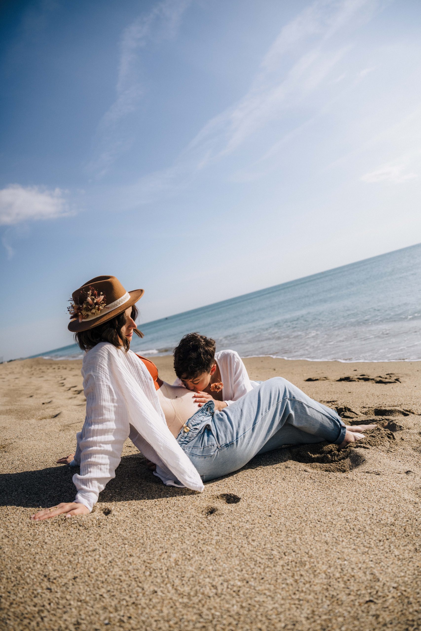 Couple se détendant sur la plage d'Argelès-sur-Mer durant leur séance grossesse, profitant du soleil et de la vue sur la mer.
