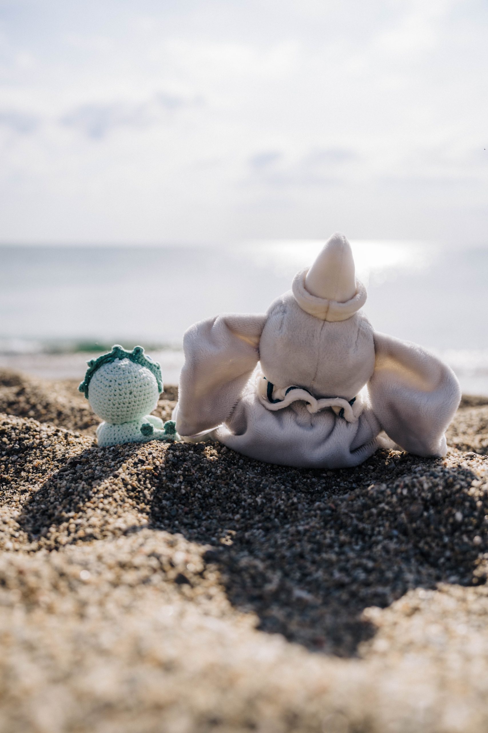 Deux peluches, un éléphant et un dinosaure en crochet, posées sur le sable de la plage d'Argelès-sur-Mer, symbolisant l'arrivée de bébé lors d'une séance grossesse.