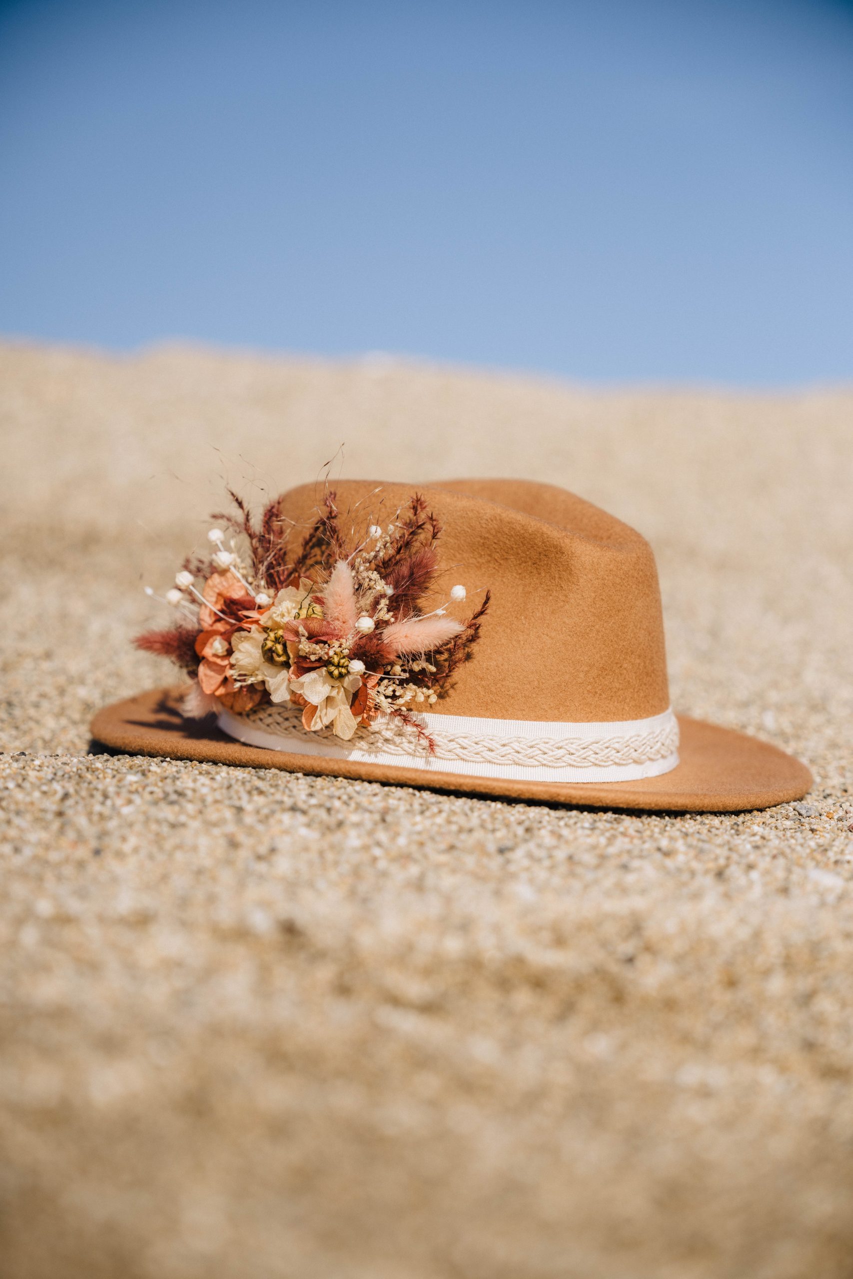 Un chapeau de couleur sable orné de fleurs séchées, de Gypsophile et de blé, posé sur le sable de la plage d'Argelès-sur-Mer, comme accessoire de la séance grossesse.