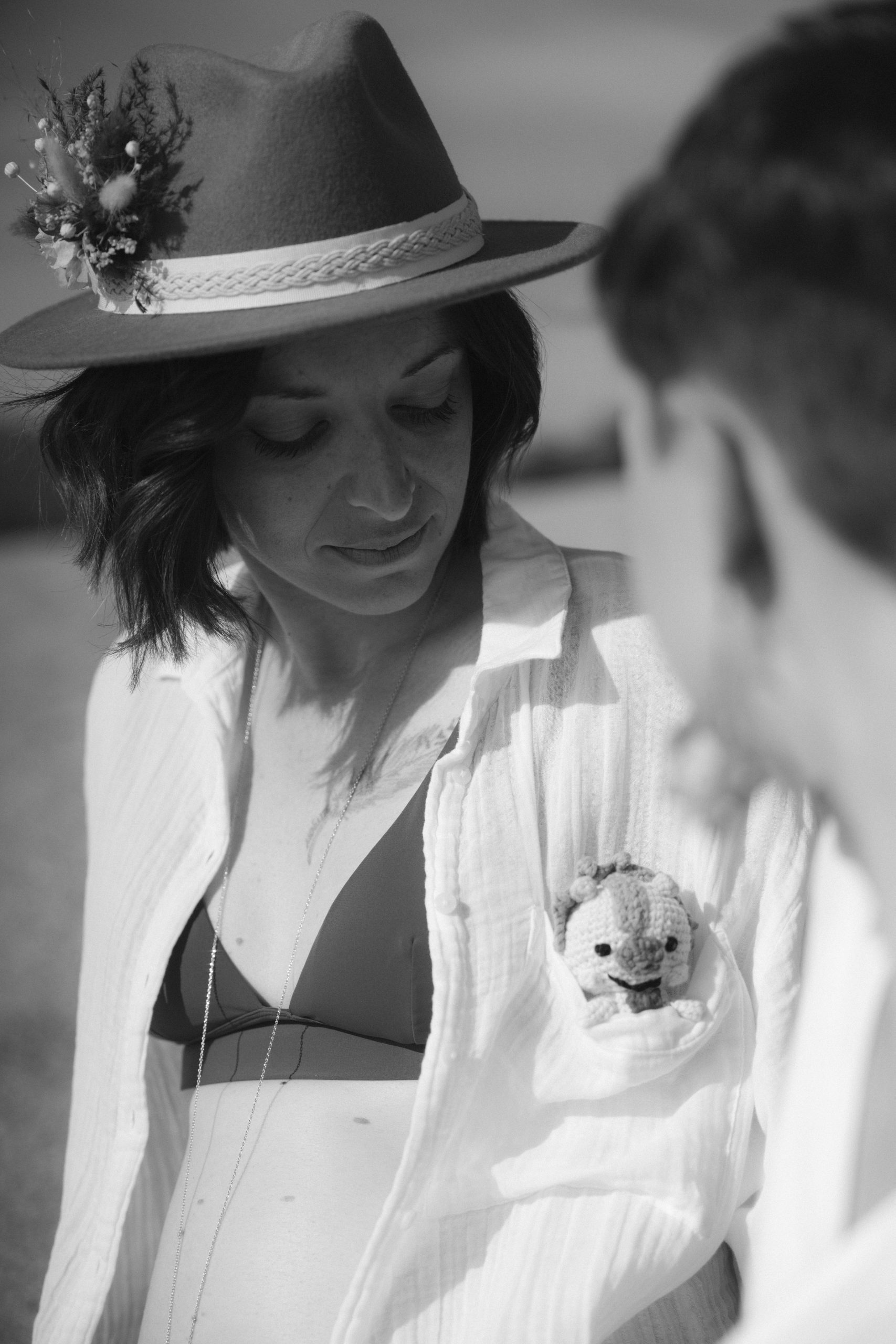Gros plan en noir et blanc sur Nelly, le ventre de grossesse apparent et une peluche de dinosaure en crochet dans sa poche, portant un chapeau orné de fleurs séchées, pendant sa séance grossesse à Argelès-sur-Mer.