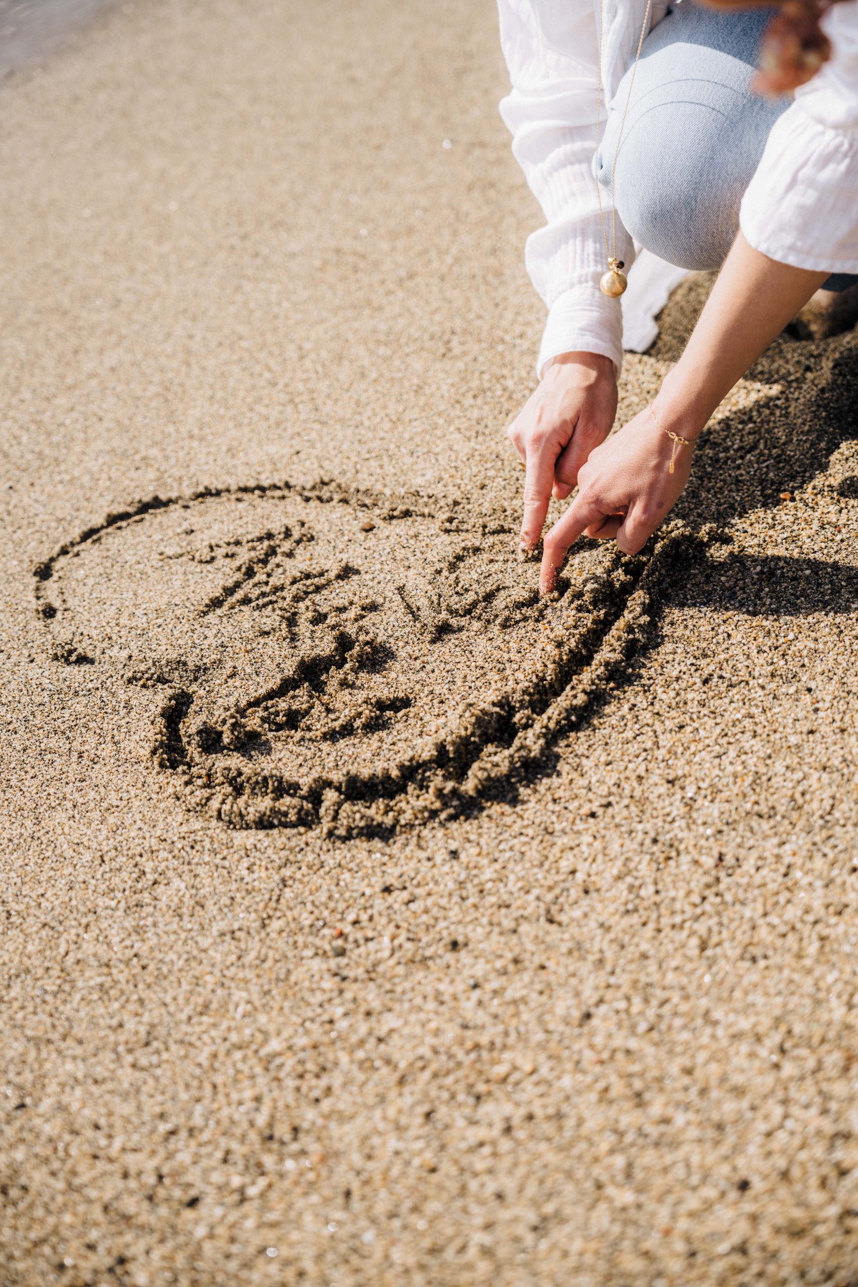 Un cœur dessiné dans le sable humide au bord de l'eau, symbolisant l'amour de Nelly et Audrey pendant leur séance grossesse à Argelès-sur-Mer.