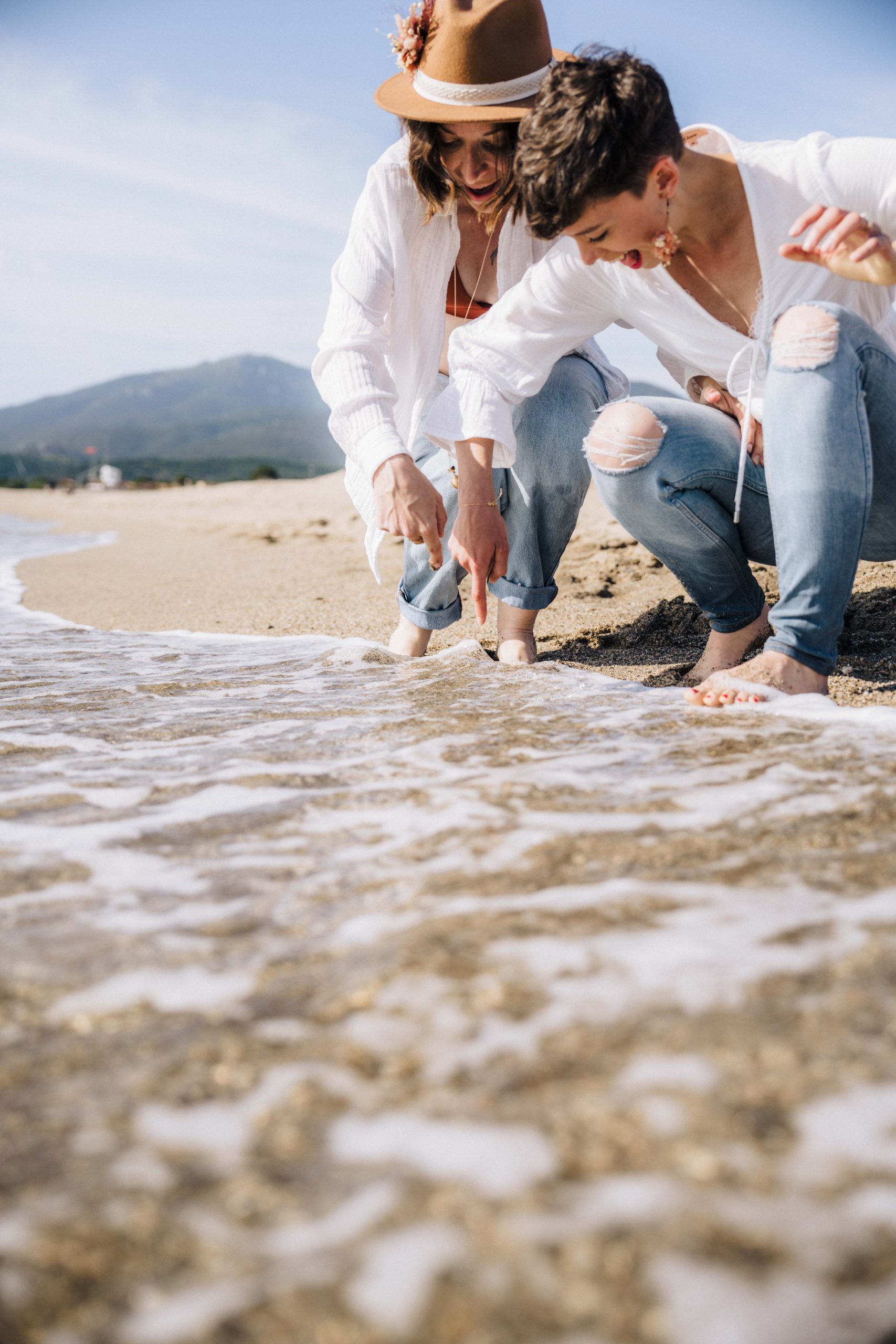 Nelly et Audrey marchant main dans la main au bord de l'eau sur la plage d'Argelès-sur-Mer, Nelly avec son ventre de grossesse exposé, profitant des vagues.