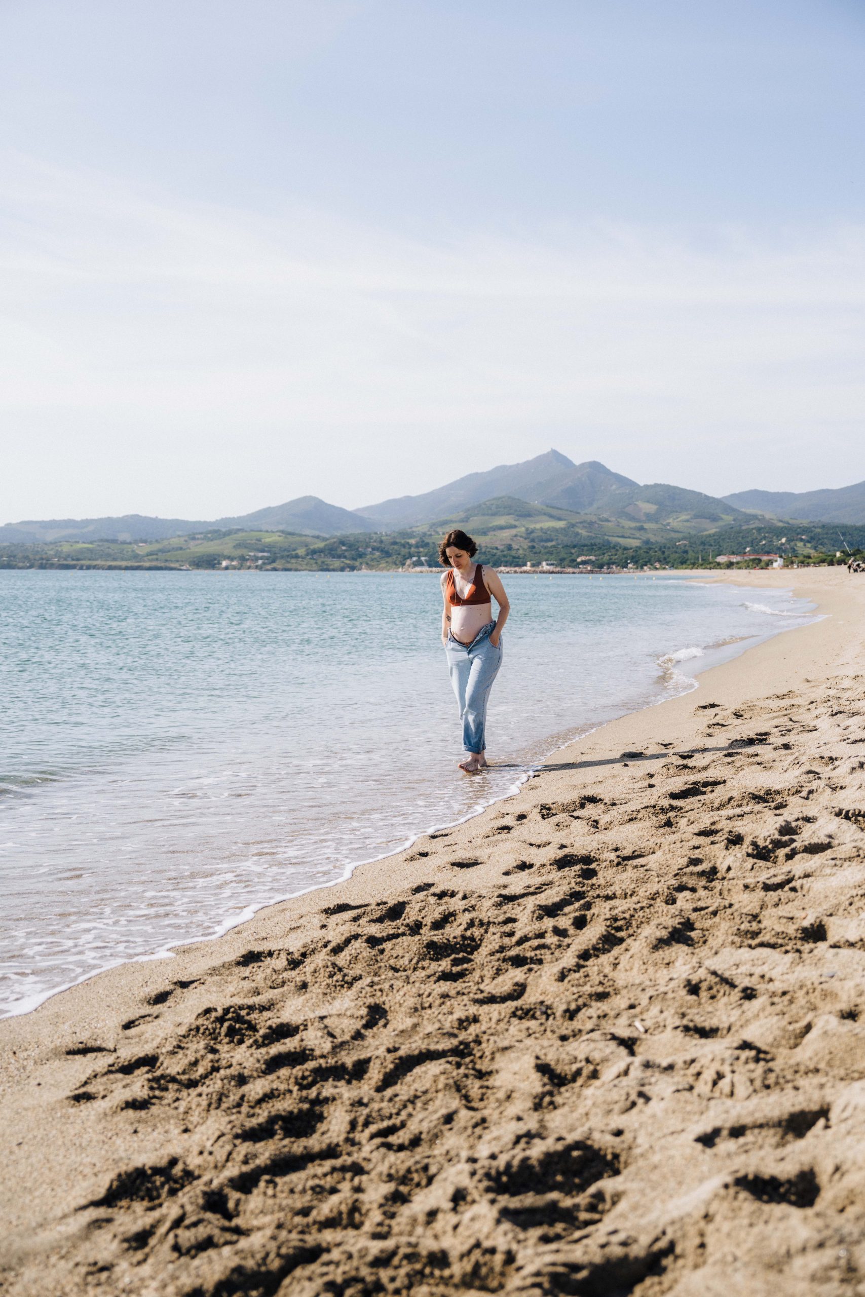 Nelly marchant seule au bord de l'eau sur la plage d'Argelès-sur-Mer, le regard tourné vers le sable, avec la mer et les montagnes en arrière-plan, lors de sa séance grossesse.